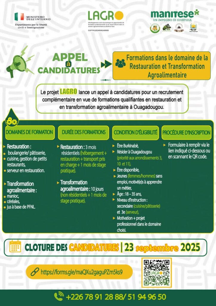 Le projet 𝐋𝐀𝐆𝐑𝐎 t’offre une opportunité unique de suivre une formation qualifiante GRATUITE à Ouagadougou !