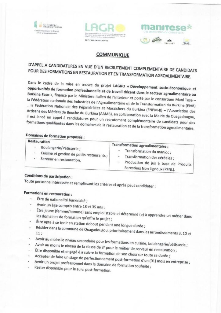 Le projet « LAGRO : Développement socioéconomique et opportunités de formation professionnelle et de travail décent dans le secteur agroalimentaire au Burkina Faso », financé par le @Viminale – Ministero dell’Interno est mis en œuvre par Mani Tese et ses partenaires FIAB/AJAAl , @AAMB Chez Chef André – artisan chocolatier Burkina Faso , Fédération Nationale des Pépiniéristes et Jardiniers du Burkina Faso et la Mairie de Ouagadougou officiel.