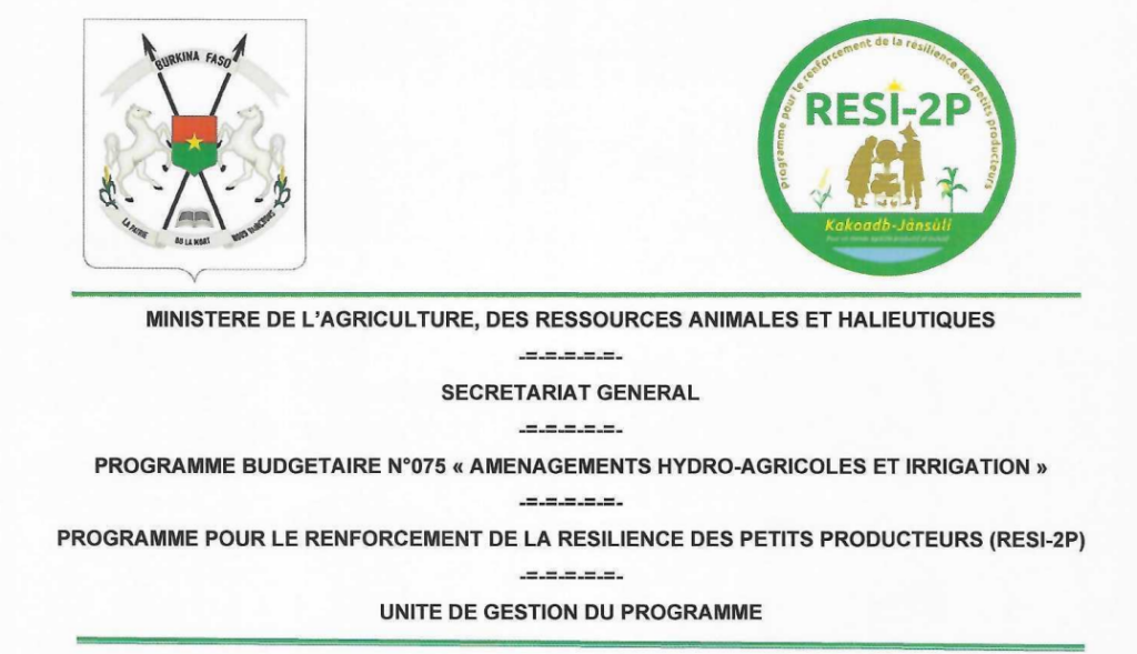 Le Programme pour le renforcement de la résilience des petits producteurs (RESI-2P) est un programme qui vise à consolider les capacités d’adaptation des populations rurales aux chocs externes et aux effets du changement climatique et à renforcer la résilience des petits exploitants, en particulier des femmes et des jeunes, par des investissements durables visant la sécurité alimentaire et nutritionnelle et l’augmentation des revenus au Burkina Faso.