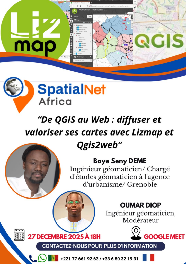 Dans le cadre de sa mission de vulgarisation des outils géospatiaux, SpatialNet Africa organise une session en ligne intitulée : « De QGIS au Web : diffuser et valoriser ses cartes avec Lizmap et Qgis2web » Ce webinaire propose une immersion dans les outils de publication cartographique en ligne à partir de QGIS, avec un focus sur Lizmap et Qgis2web, deux extensions puissantes pour transformer des projets SIG en applications web interactives. 📅 Date : 27 décembre 2025 🕕 Heure : 18h (GMT) 📍 Plateforme : Google Meet Lien d’inscription: https://lnkd.in/eubbt6sM